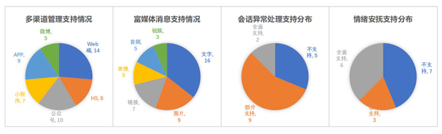 總體而言,參評產(chǎn)品在多渠道管理支持能力和富媒體消息互動(dòng)支持能力方面表現(xiàn)良好,所有參評產(chǎn)品均支持兩種及其以上渠道管理,G的支持達(dá)到六種,多面覆蓋了PC端和移動(dòng)端用戶。參評產(chǎn)品在會(huì)話異常處理上表現(xiàn)比較接近,大部分產(chǎn)品部分支持該功能,在情緒安撫功能支持上兩J化差異較明顯,多面支持和不支持?jǐn)?shù)量相近,兩者合計(jì)數(shù)量占比超過八成。主要有以下三個(gè)方面的特點(diǎn):
