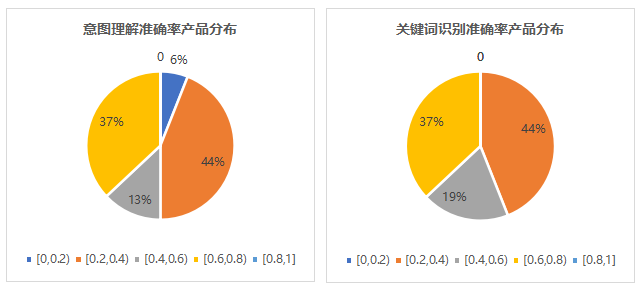 通過圖3中的性能指標(biāo)產(chǎn)品分布情況可知,多數(shù)參評產(chǎn)品意圖理解和關(guān)鍵詞識(shí)別準(zhǔn)確率分布在[0.2,0.4)和[0.6,0.8),反映出參評產(chǎn)品在性能上的兩級分化,建議相關(guān)企業(yè)及時(shí)豐富疫情相關(guān)語料并進(jìn)行產(chǎn)品優(yōu)化,提升問題解決率。