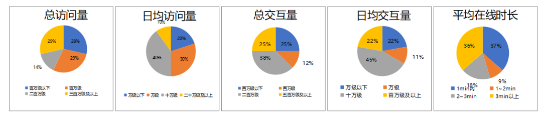 從訪問量上看,超七成產(chǎn)品的總訪問量達(dá)到了百萬級,其中總訪問量超過二百萬和三百萬的產(chǎn)品約占三成;從日均訪問量上看,約70%的產(chǎn)品日均訪問量在一萬到二十萬之間,僅有10%的產(chǎn)品突破了二十萬大關(guān);從交互量上看,約75%的產(chǎn)品總交互量超過了百萬條,約78%的產(chǎn)品日均交互量超過一萬條;從用戶平均在線時(shí)長上來看,超五成產(chǎn)品達(dá)到了2分鐘以上,約37%的產(chǎn)品用戶平均在線時(shí)長不足1分鐘,另外平均在線時(shí)長超過3分鐘的產(chǎn)品數(shù)約占36%。