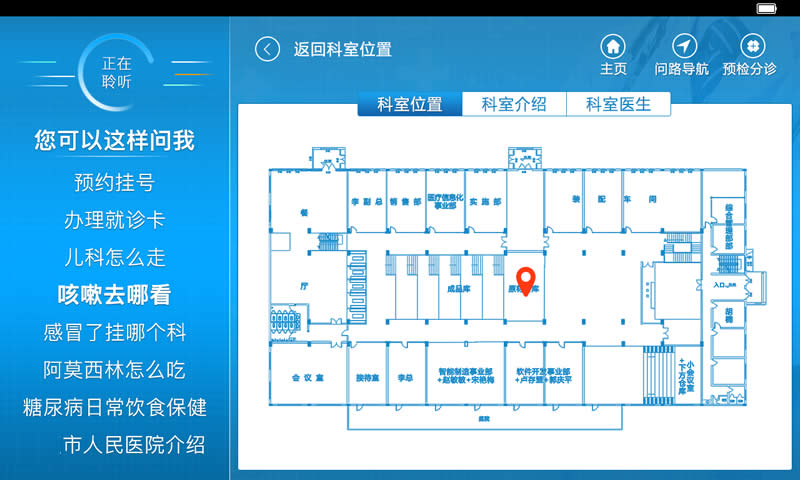 這些問題機器人都能告訴您答案,患者說到“以前都沒有在醫(yī)院見過機器人,它好可愛啊,還這么專業(yè)這么智能,太厲害了。以前看病總是不知道要去哪個科室,也不清楚科室對應的位置方向,在導醫(yī)臺咨詢排隊要排好久,有了這個機器人后看病咨詢更加方便了!