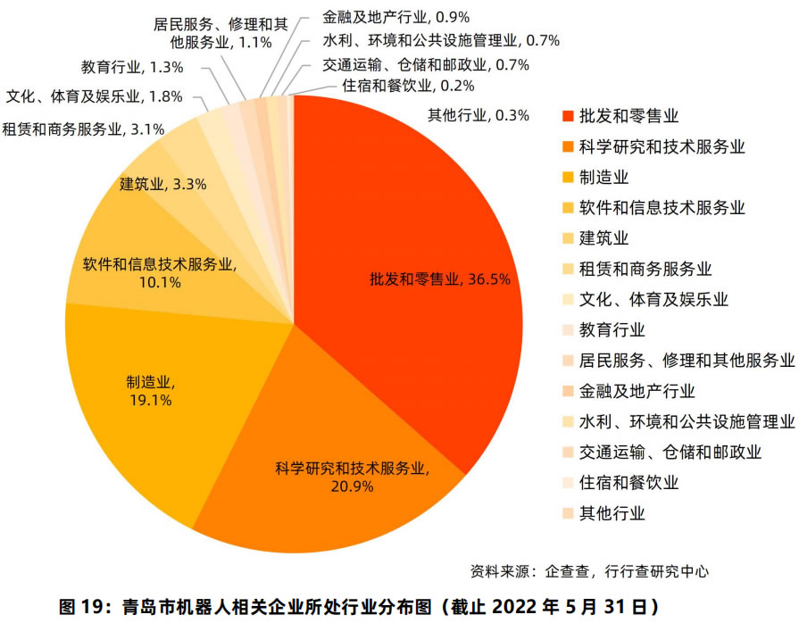 從機(jī)器人產(chǎn)業(yè)鏈相關(guān)企業(yè)所處行業(yè)來看,截至 2022 年 5 月,青島市機(jī)器人相關(guān)企 業(yè)中,有 36.5%的企業(yè)從事批發(fā)和零售業(yè);其次為科學(xué)研究和技術(shù)服務(wù)業(yè),占比為 20.9%; 制造業(yè)、軟件和信息技術(shù)服務(wù)業(yè)占比分別為 19.1%和 10.1%。從行業(yè)分布結(jié)構(gòu)可以看出, 青島市機(jī)器人相關(guān)企業(yè)多布局在零部件及終端產(chǎn)品銷售、科研技術(shù)服務(wù),以及工業(yè)制造 L域,而消費(fèi)級(jí)的服務(wù)型機(jī)器人未來將有著廣闊的市場(chǎng)空間。