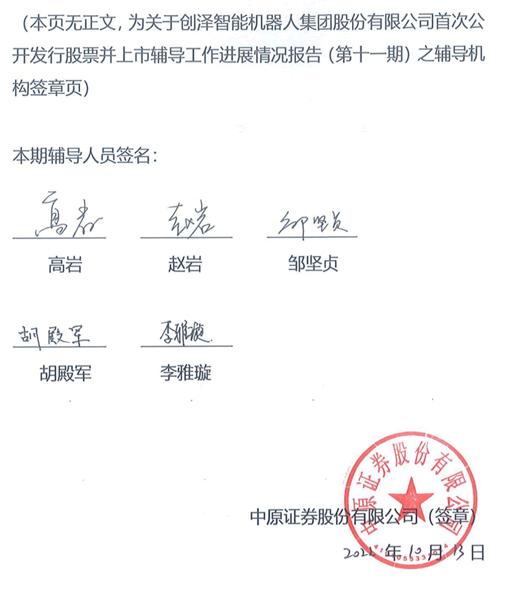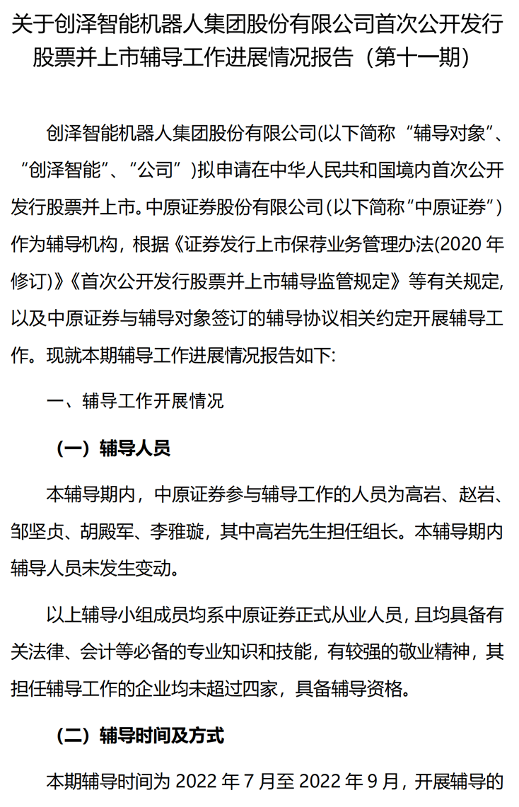 創(chuàng)澤智能機器人集團股份有限公司首次公開發(fā)行股票并上市輔導(dǎo)工作進展報告(第十一期)