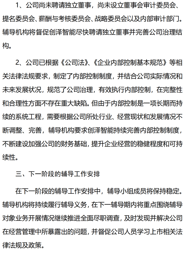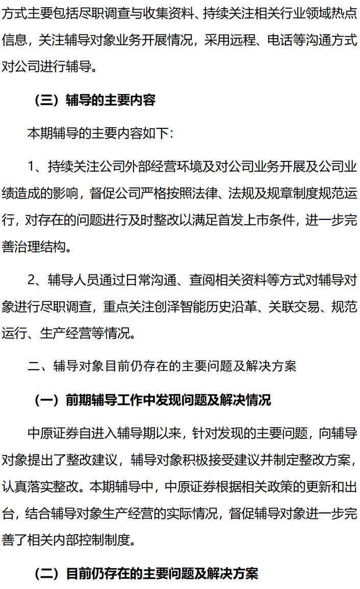 中原證券關(guān)于創(chuàng)澤機器人上市輔導(dǎo)內(nèi)容,對公司業(yè)務(wù)開展及公司業(yè)績造成的影響,督促公司嚴格按照法律,法規(guī)及規(guī)章制度規(guī)范運行,關(guān)注創(chuàng)澤智能歷史沿革生產(chǎn)經(jīng)營等情況