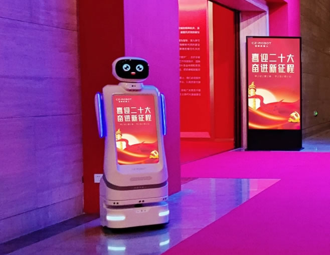創(chuàng)澤迎賓引導機器人具有類人形結構有一個圓圓的腦袋,胸前有一個27寸大屏幕,自主識別用戶記錄下相應的時間,與設置的考勤系統(tǒng)核對