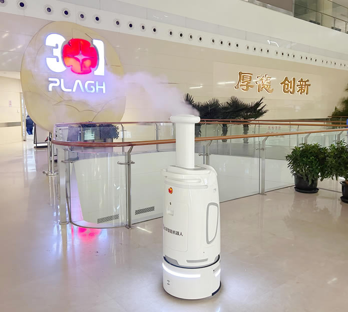 在中國人民解放軍總醫(yī)院D一醫(yī)學(xué)中心的門診大廳里,創(chuàng)澤智能消毒機(jī)器人頭D噴霧在醫(yī)院門診大廳走來走去進(jìn)行全域消毒殺菌,實現(xiàn)消毒效果量化管理