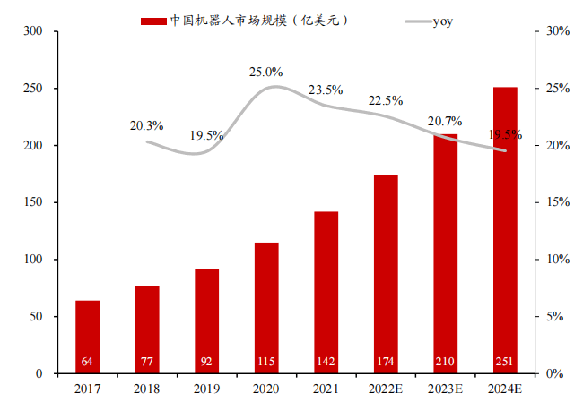 根據(jù)IFR、中國電子學會數(shù)據(jù),預計機器人市場規(guī)模2024年有望達到660億美元,2020-2024年CAGR約18%。