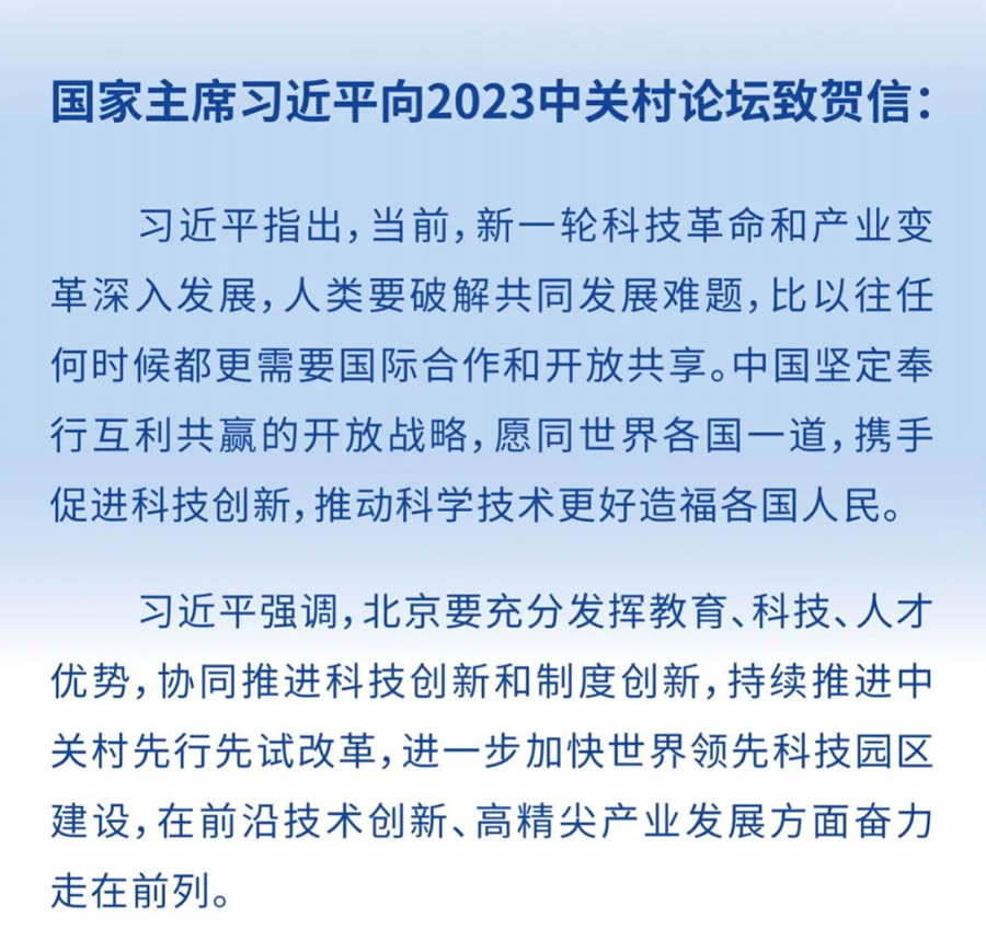 2023中關(guān)村論壇由科技部、國家發(fā)展改革委、工業(yè)和信息化部、國務(wù)院國資委、中國科學院、中國工程院、中國科協(xié)、北京市政府共同主辦,25日在北京開幕。 政治局委員、北京市委書記尹力在開幕式上宣讀了主席的賀信。政治局常委、國務(wù)院副總理丁薛祥出席開幕式并致辭。 丁薛祥指出,主席專門發(fā)來賀信,充分體現(xiàn)了對科技創(chuàng)新和國際合作的G度重視。新時代十年,中國把科技創(chuàng)新擺在國家發(fā)展全局的核心地位,推動科技事業(yè)發(fā)展取得顯著成就,進入創(chuàng)新型國家行列。