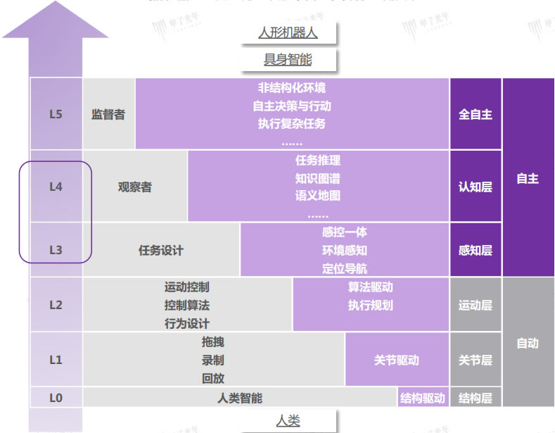 第三代為智能機器人(L4-L5):擁有更豐富的傳感器和更G的智能水平,不僅能獲取并處理外部綜合信息,甚至能據(jù)此自己制定行動目標(biāo),其智能主要體現(xiàn)在感知交互、獨立決策、自我優(yōu)化三個方面。