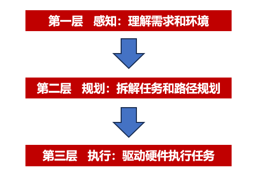 AI 機(jī)器人在完成任務(wù)時(shí)需要經(jīng)歷三個(gè)層次。給到機(jī)器人一個(gè)任務(wù)時(shí),機(jī)器人一般要經(jīng)歷