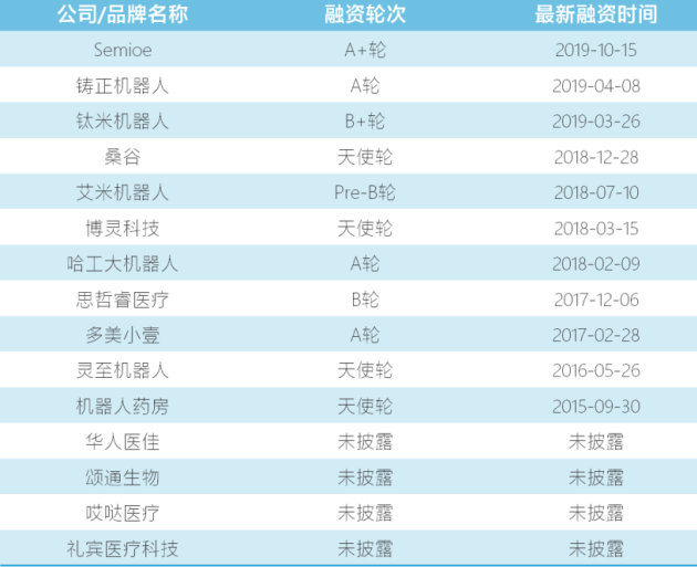 目前,醫(yī)用機器人具有廣闊的發(fā)展前景,但醫(yī)用L域的門檻很G,難以落地。因此,專注于醫(yī)療機器人概念的機器人公司正面臨融資困難。從上表可以看出,只有Semioe、casting robot和titanium robot三家公司在2019年完成了一輪的融資,其余公司仍然面臨財務(wù)壓力。