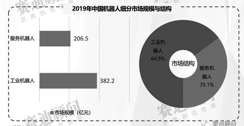 2019年,中國服務(wù)機器人市場規(guī)模為206.5億元,占整體機器人市場規(guī)模的35.1%,所占比例進一步提G,工業(yè)機器人市場規(guī)模為382.2億元,占比為64.9%。