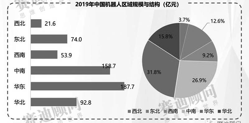 2019年,華東、中南、華北地區(qū)是中國機器人發(fā)展較好的區(qū)域市場,市場份額分別達到31.8%、26.9%和15.8%。隨著機器人的應(yīng)用場景不斷擴大與滲透,東北、西南、西北地區(qū)機器人市場規(guī)模呈現(xiàn)增長趨勢,市場份額將進一步提升。